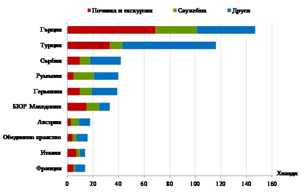 През септември 2017 г. най-голям брой пътувания на български граждани са осъществени към: Гърция - 147.4 хил., Турция - 115.7 хил., Сърбия - 42.0 хил., Румъния - 39.6 хил., Германия - 38.8 хил., бившата югославска република Македония - 32.6 хил., Австрия - 17.9 хил., Обединеното кралство - 15.3 хил., Италия - 14.6 хил., и Франция - 13.4 хиляди (фиг. 3).