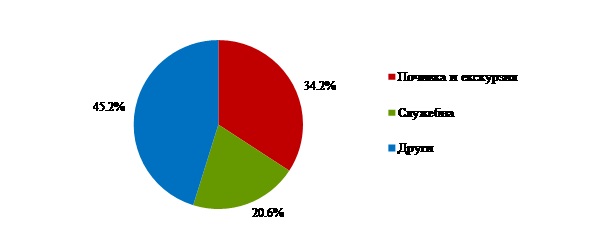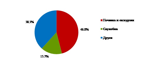 През септември 2017 г. преобладава делът на посещенията с цел почивка и екскурзия - 46.0%, следвани от посещенията с други цели - 38.3%, и със служебна цел - 15.7% (фиг. 5).