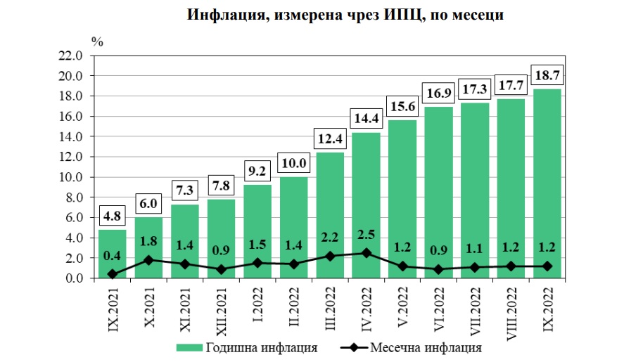 Инфлацията от началото на годината (септември 2022 г. спрямо декември 2021 г.) е 14.0%, а средногодишната инфлация за периода октомври 2021 - септември 2022 г. спрямо периода октомври 2020 - септември 2021 г. е 12.8%.