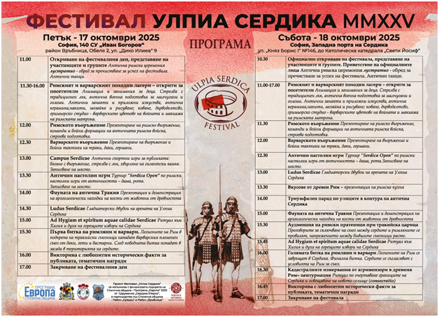 /КРОСС/ Готови ли сте за телепортация във времето? На 17 и 18 октомври 2025 г. жителите и гостите на София ще могат да се върнат 2000 години назад с фестивала „Улпиа Сердика MMXXV". Събитието ще се проведе на 17 октомври (петък) в 140 СОУ „Иван Богоров" в Обеля и на 18 октомври (събота) на археологическия обект „Западната порта на Сердика", в близост до Католическата катедрала „Свети Йосиф" и метростанция „Сердика".
