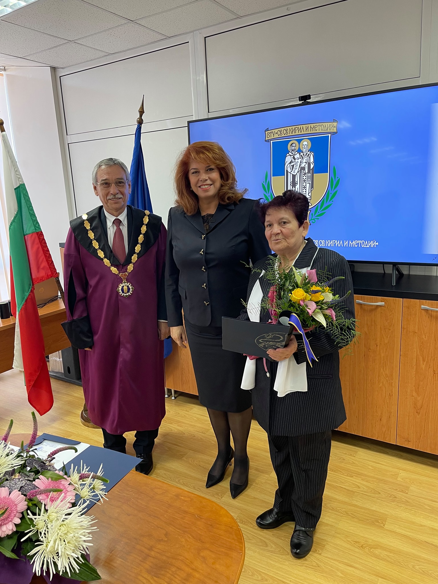 /КРОСС/ С решение на Академичния съвет на университета с Евтимиевата награда за заслуги към ВТУ „Св. св. Кирил и Методий" бяха удостоени проф. д.ф.н. Димитър Вълчев Петров-Кенанов; проф. д.ф.н Иван Харалампиев Иванов; проф. д.ф.н. Невяна Ангелова Дончева-Панайотова и проф. д-р Мария Антонова Спасова. С почетното звание „Почетен професор на ВТУ" бе отличен доц. д-р Владимир Пенчев Попов.