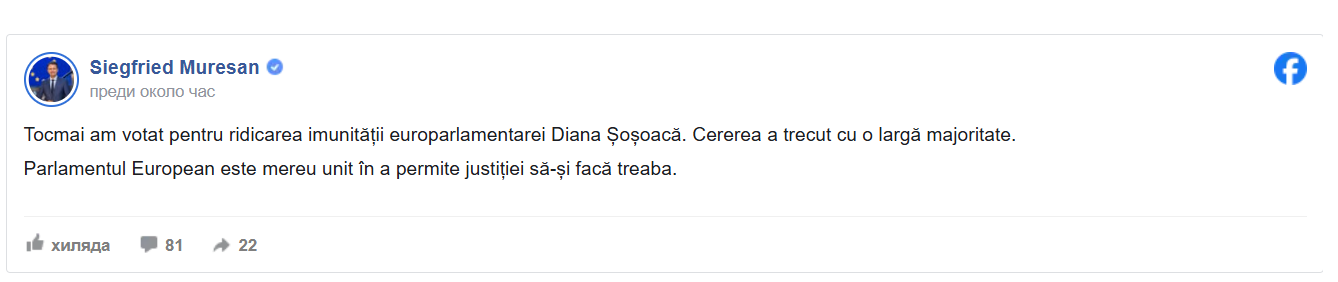 „Току-що гласувах за сваляне на имунитета на евродепутата Диана Шошоака. Искането беше прието с голямо мнозинство. Европейският парламент винаги е единодушен в това да позволи на съдебната система да си върши работата", написа във фейсбук румънският евродепут Зигфрид Мурешан.