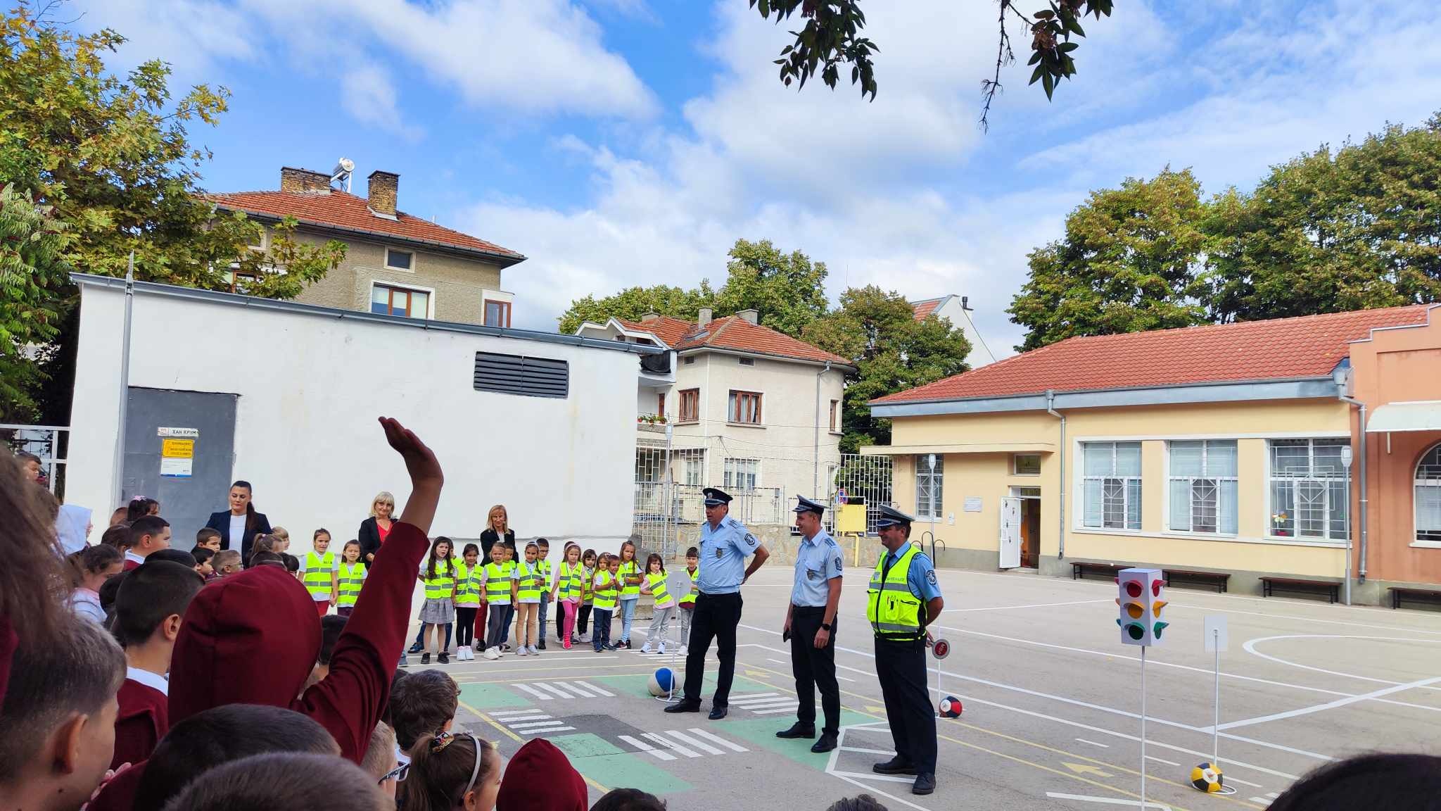/КРОСС/ Първокласници от НУ "Илия Р. Блъсков" в Шумен и деца от подготвителната група в училището се включиха в инициативата на Областната дирекция на МВР - Шумен, насочена към превенция на най-малките участници в движението. С помощта на полицейските инспектори Милен Минев, Тунай Йонуз и Йордан Жеков научиха важни правила за движение и игри. Откритият урок по безопасност е в рамките на Дните по безопасност 16-22 септември 2024 г. с мотото "Остани жив! Пази живота!", организиран от Европейската мрежа на службите на пътна полиция ROALDPOL. Освен ценни съвети, първокласниците получиха първия си правилник по пътна безопасност.