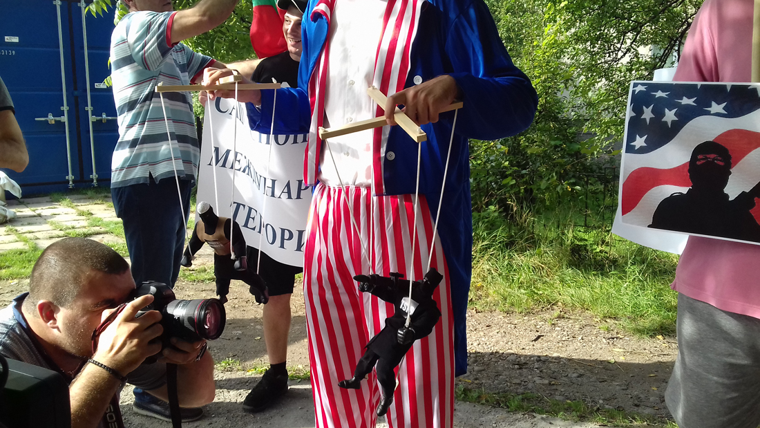 Централен образ на протеста беше Чичо Сам, който държеше две марионетки – едната, илюстрираща терорист от т. нар. „Ислямска държава“, а другата - екстремист от свързаната с терористите организация „Белите каски“.
