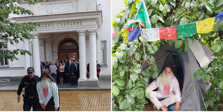 От снимката се вижда, че твореца е бос, а полицията го извежда към палатката в градинката срещу входа на Парламента, която той днес разположи в знак на протест срещу моралното дъно до което достигнаха избраниците на народа.