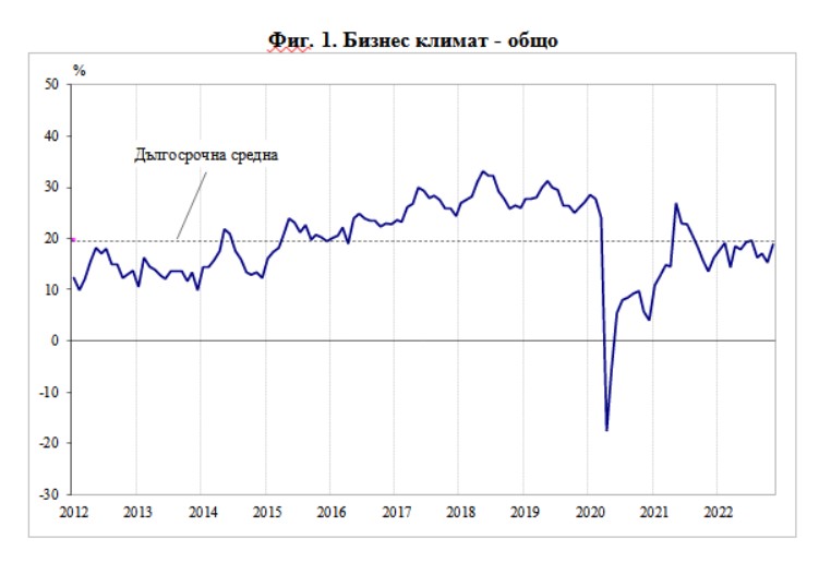 /КРОСС/ През ноември 2022 г. общият показател на бизнес климата се покачва с 3.5 пункта в сравнение с предходния месец, като ръст на показателя е регистриран във всички наблюдавани сектори - промишленост, строителство, търговия на дребно и услуги, отчитат от НСИ след проведени анкети сред представители на основните икономически дейности у нас.