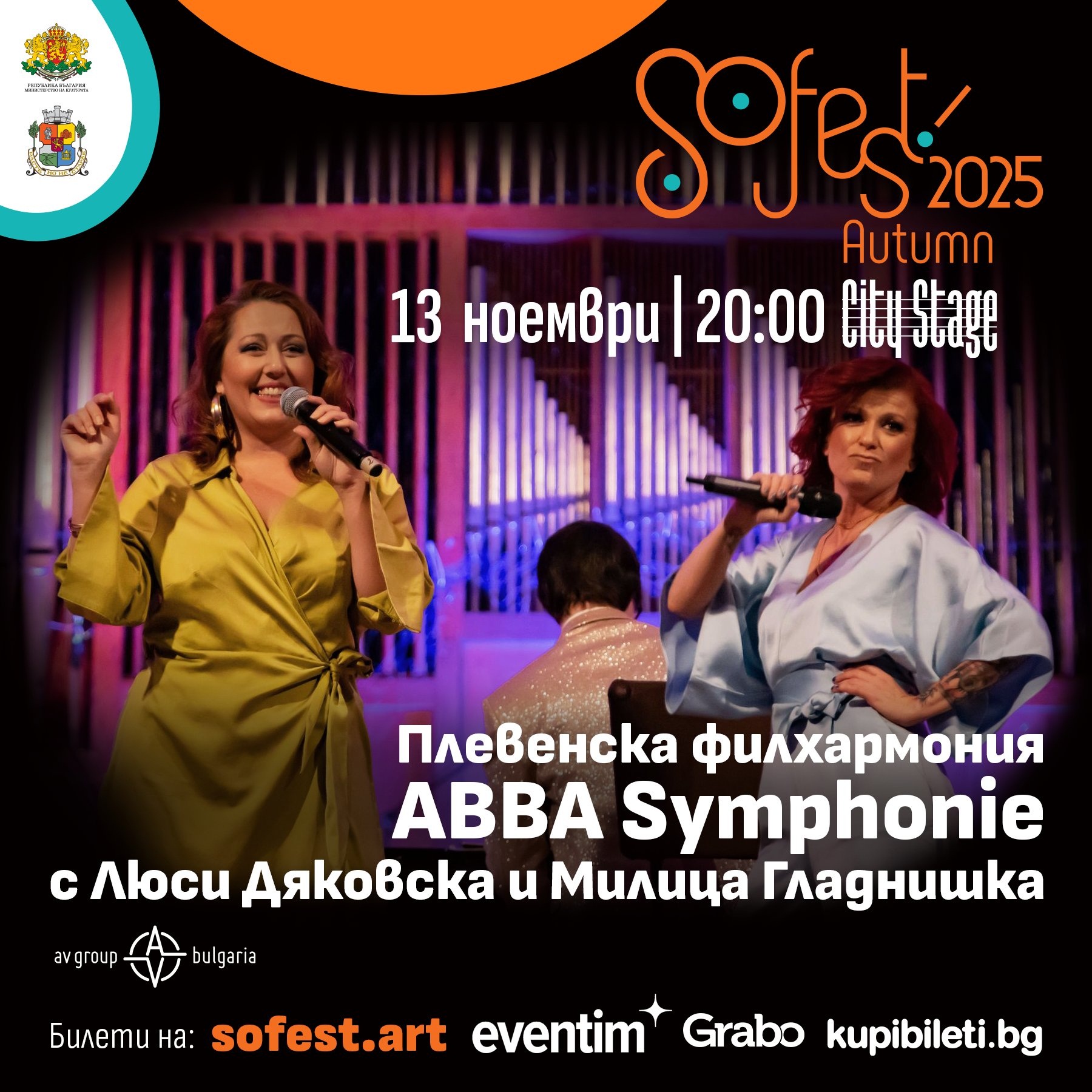 /КРОСС/ Днес, 13-ти ноември (четвъртък), от 20 часа, в столичния клуб City Stage, Плевенската филхармония под диригентството на маестро Георги Милтиядов ще открие есенното издание на традиционния за София SoFest. Програмата на вечерта е част от националното турне ABBA SYMPHONIE, обиколило вече цяла България със солисти двете неотразими диви - огнената Люси Дяковска и не по-малко темпераментната Милица Гладнишка.