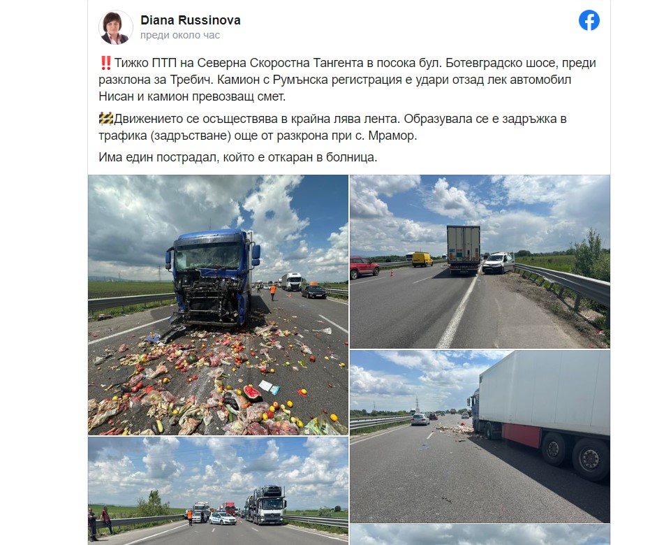 За пътния инцидент съобщи във Facebook и председателят на Европейския център за транспортни политики Дияна Русинова. Образувало се е задръстване още от разклона при с. Мрамор.