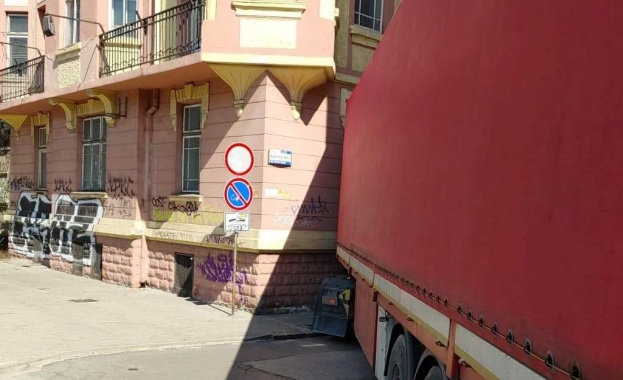 /КРОСС/ Тир се заклещи между две сгради в София, става ясно от публикация във фейсбук групата "Катастрофи в София".
