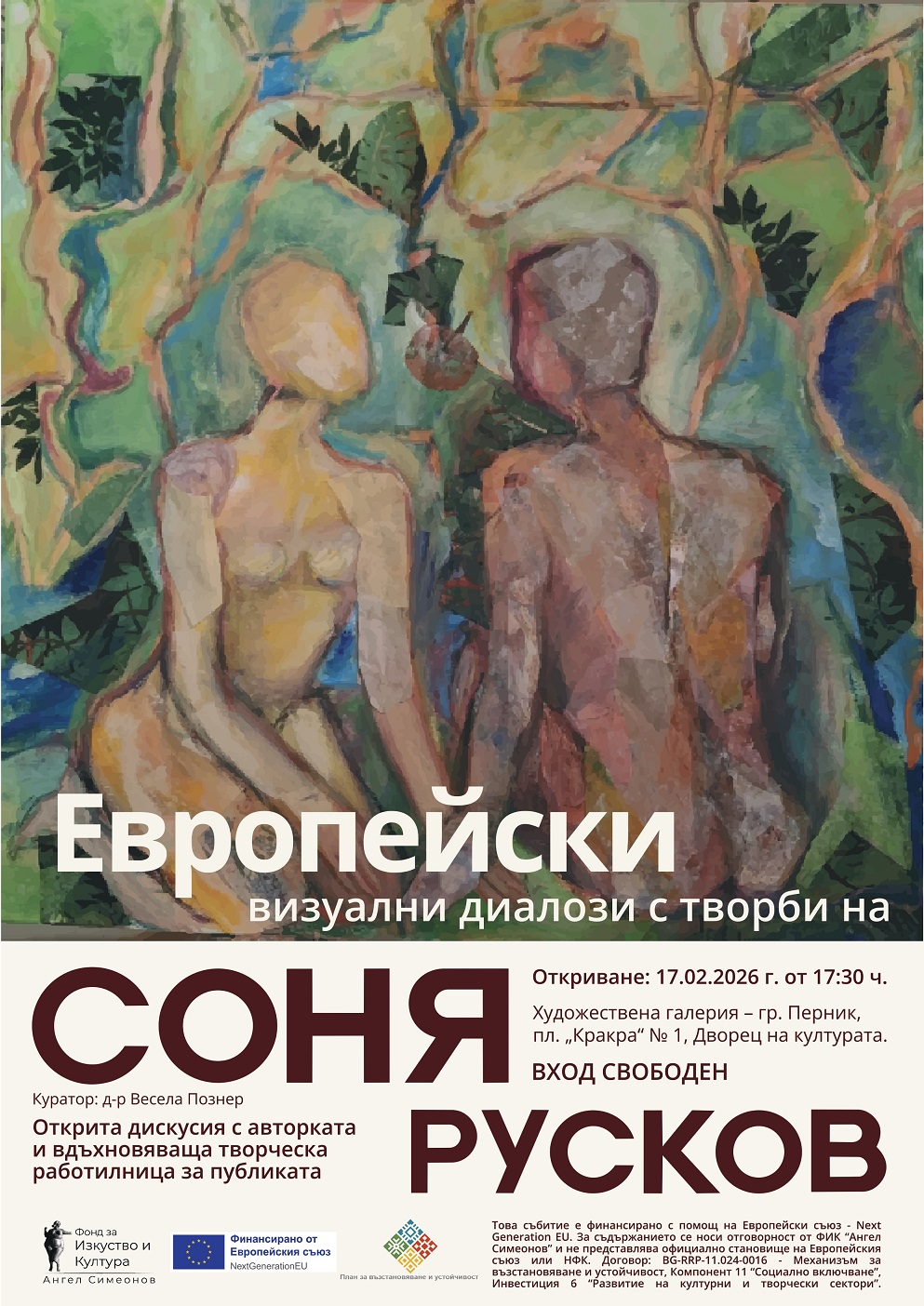/КРОСС/ Фонд за изкуство и култура „Ангел Симеонов" Ви кани на откриването на изложба „Европейски визуални диалози с творби на Соня Русков", на 17.02.2026 г., в град Перник, галерия „При Кмета", - вход свободен. Куратор на изложата е Весела Познер.