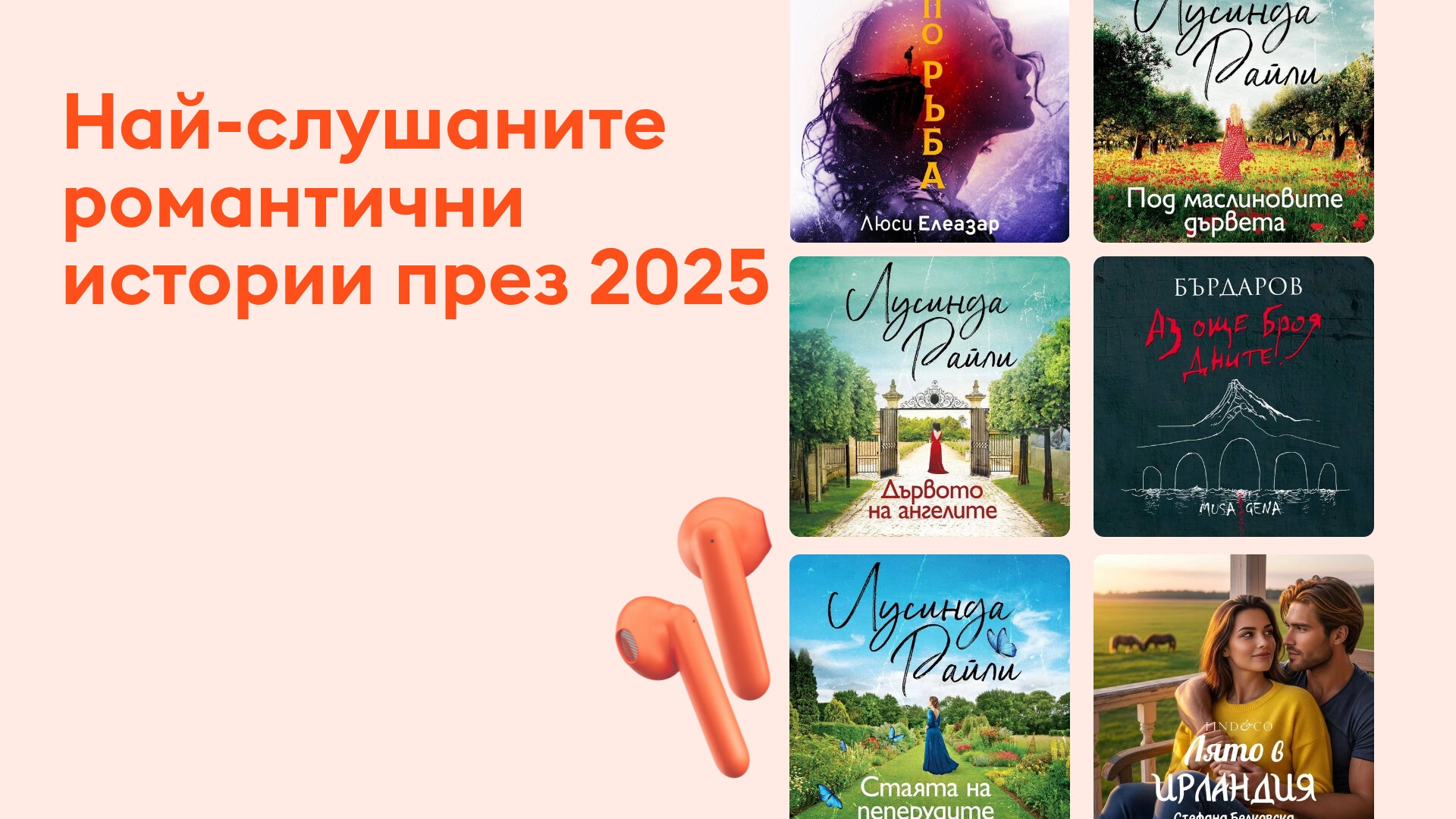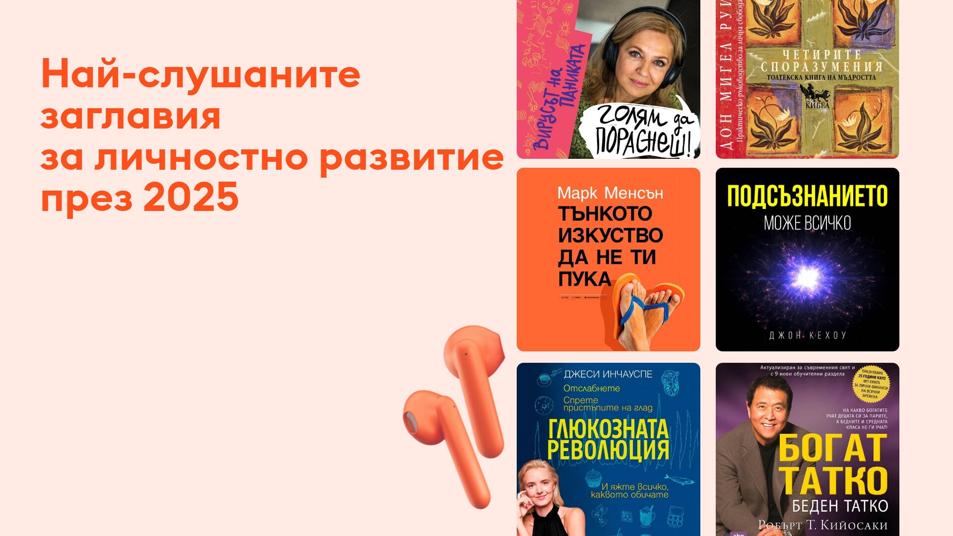 Най-слушани в България през 2025 г. са били аудиокнигите и подкастите за самоусъвършенстване. Заглавията от художествената литература с обща тематика остават с минимална разлика на второ място. На трето се нареждат детските аудиокниги, на четвърто са фентъзи произведенията, а на пето - романтичните истории.