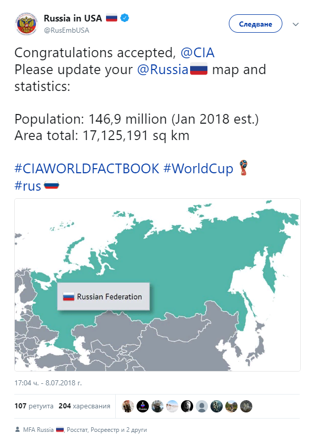 „Поздравите са приети, ЦРУ. Моля, обновете Вашата карта на Русия и статистиката за нея“, написаха дипломатите на Москва в отговор.