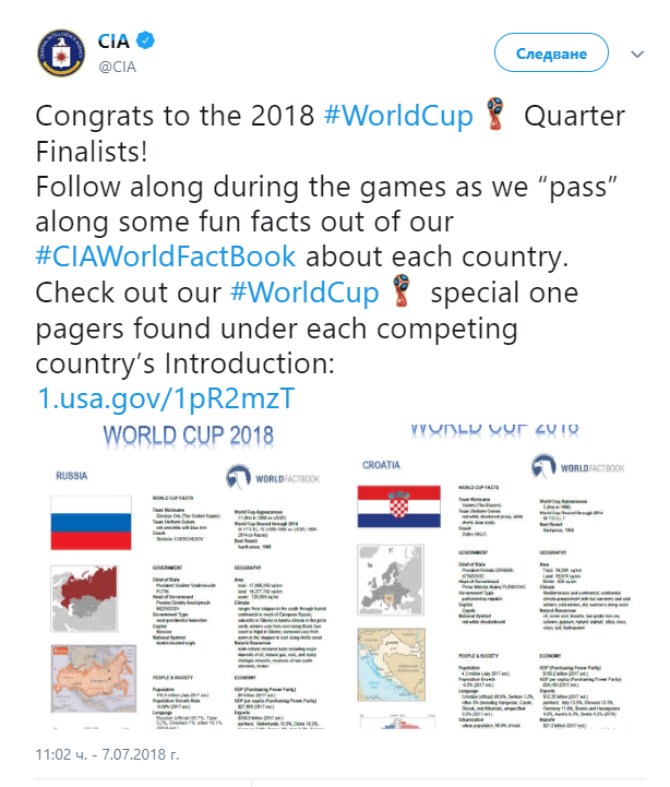 Преди двубоя Русия-Хърватия ЦРУ публикува в социалната мрежа „Туитър“ любопитни неща за Русия от „Световната книга за факти на ЦРУ“. В един от постовете бе приведена карта на страната, а в друг – статистически данни за нея.