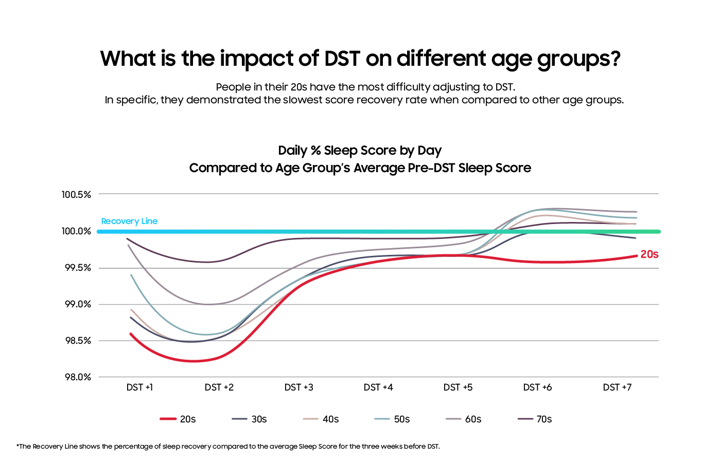 Освен това индексът на съня (Sleep Score) - изчислен въз основа на оценка на общата продължителност на съня, времето, през което си буден, цикъла на съня, както и на физическото и психическото възстановяване на потребителите - e на най-ниско ниво седмици след промяната на ЛЧВ и отново хората на възраст около 20 години се оказват най-засегнати. При изследване на средния седемдневен резултат за съня възрастовата група на 20-годишните демонстрира най-бавно възстановяване на резултатите, докато по-възрастните възрастови групи се адаптират много по-бързо. На третата седмица индексът на съня (Sleep Score) за всички възрастови групи все още не е стабилизиран като нормален, което показва колебания в качеството на добрия сън през нощта.