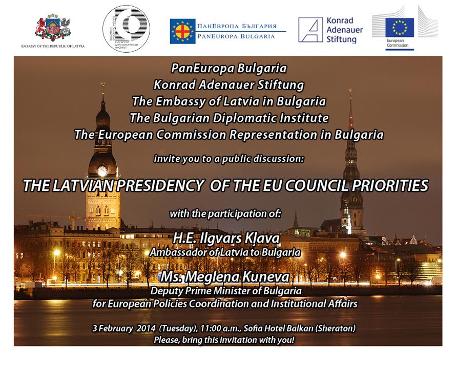 София /КРОСС/ ПанЕвропа България, Фондация „Конрад Аденауер", Посолството на Латвия в България, Българският дипломатически институт и Представителството на Европейската комисия в София, имат удоволствието да Ви поканят на публична лекция на тема „Приоритети на Латвийското председателство на Съвета на ЕС". В събитието участие ще вземат Н.Пр. Илгварс Клава, Посланик на Латвия в България и г-жа Меглена Кунева, вицепремиер по координация на европейските политики и институционалните въпроси. На срещата Н.Пр. Илгварс Клава ще представи приоритетите на Латвийското председателството на Съвета на ЕС и ще предложи ценен поглед към развитието на Европа през идните шест месеца. Той ще представи приоритетите на страната, сред които са: постигане на „лек" федерализъм, общата политика за сигурност, цифровият дневен ред на Европа, въпросите свързани с миграцията и данъците, както и енергийните политики.