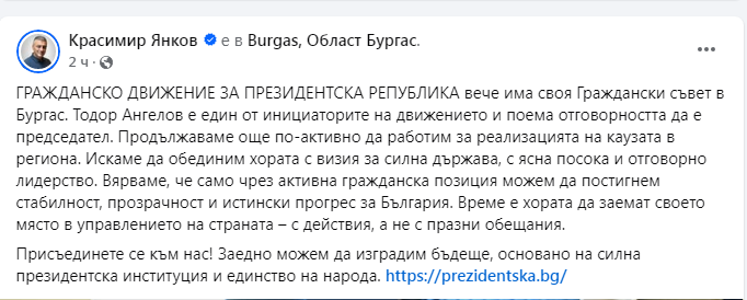 /КРОСС/ Гражданско движение за президентска република вече има своя Граждански съвет в Бургас. Тодор Ангелов е един от инициаторите на движението и поема отговорността да е председател, написа в своя профил във фейсбус бивш народен представител Красимир Янков.