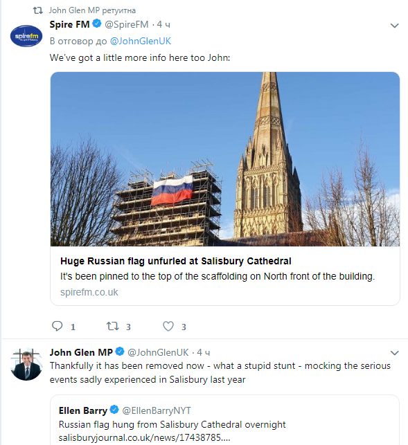 Инцидентът разгневи и члена на британския парламент в Солсбъри Джон Глен. "Каква глупава постъпка, да се подиграваш със сериозните събития, които се случиха в Солсбъри миналата година", пише политикът в Twitter, намеквайки за опита за убийство на бившия руски офицер от военното разузнаване Сергей Скрипл и дъщеря му.