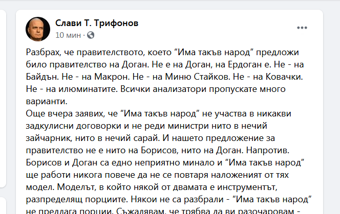 "Разбрах, че правителството, което "Има такъв народ" предложи било правителство на Доган. Не е на Доган, на Ердоган е. Не - на Байдън. Не - на Макрон. Не - на Миню Стайков. Не - на Ковачки. Не - на илюминатите. Всички анализатори пропускате много варианти.