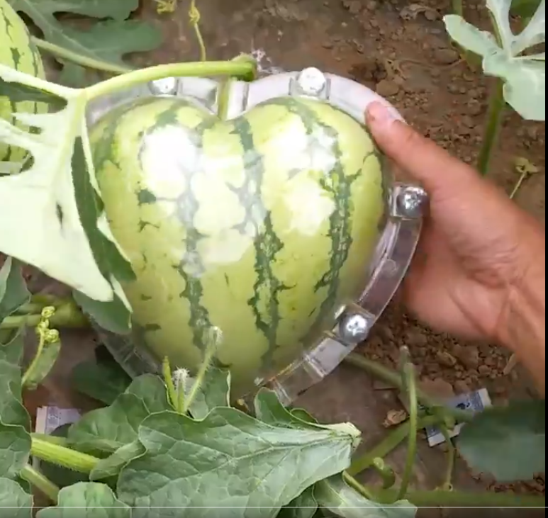 Плодът се деформира като се поставя в пластмасова форма. Динята с вид на сърце също е голям хит.
