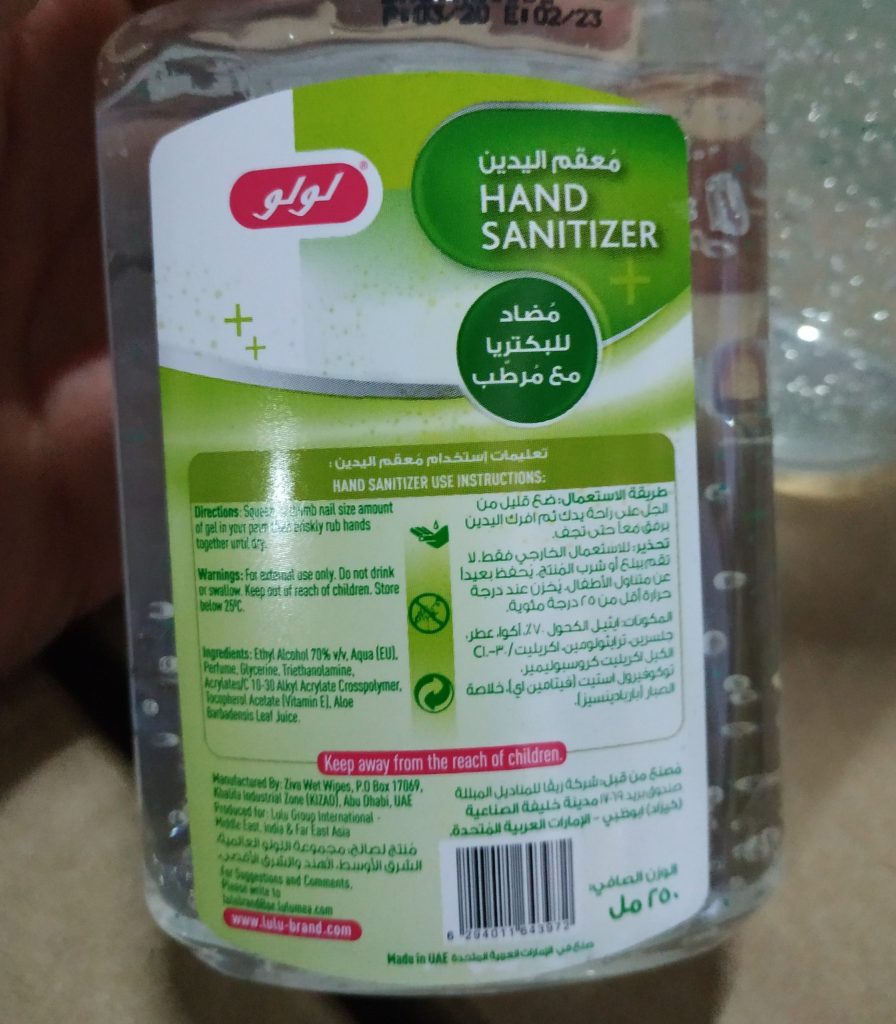 На бутилките личи бренда LuLu. Това е голяма верига супермаркети в ОАЕ с индийска собственост. Тя комерсиализира и продукти под тази своя марка. Конкретният дезинфекциращ гел е произведен от дубайската компания Ziva West Wipes. Проверка в сайта за онлайн пазаруване на LuLu показва, че именно този продукт с нейния бренд не се продава.