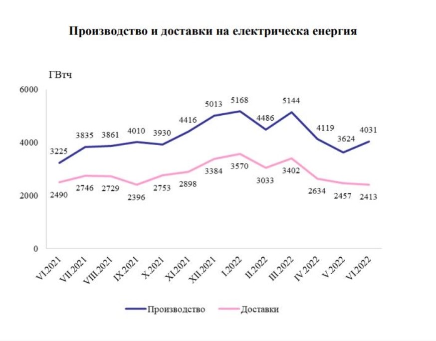 През юни у нас са произведени 4,03 тераватчаса електроенергия, което представлява увеличение от 25% на годишна база. На българския пазар са реализирани 2,4 тераватчаса и спрямо юни 2021 година има намаление от 3,1 на сто. Спрямо май доставките също намаляват - с около 1%.