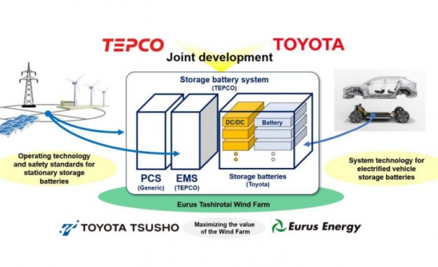 /КРОСС/ Toyota Motor Corporation разработва стационарна система за съхранение на батерии заедно с енергийния доставчик Tokyo Electric Power Company Holdings (TEPCO). Батериите в електрифицираните модели на Toyota ще помагат да се съхранява енергия от възобновяеми източници и тя да се използва в дългосрочен план - дори когато няма вятър или слънце.