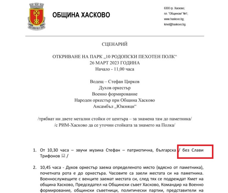 Документа на който е написан сценария е на бланка на Община Хасково. В него още в първа точка се вижда забраната за пускане на песни на Ку-Ку бенд и Слави Трифонов, които са с патриотична насоченост, по време на мероприятието.