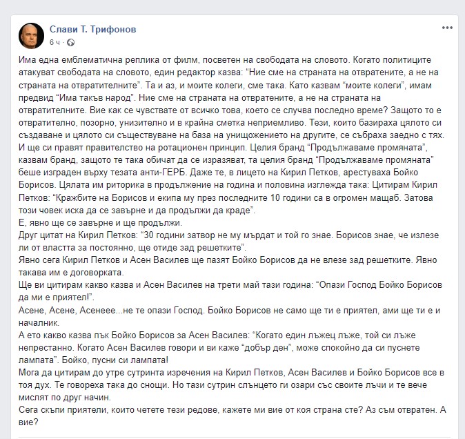 Има една емблематична реплика от филм, посветен на свободата на словото, посочва Трифонов и допълва, че когато политиците атакуват свободата на словото, един редактор казва: "Ние сме на страната на отвратените, а не на страната на отвратителните". Та и аз, и моите колеги сме така, пише той и уточнява, че има предвид "Има такъв народ" (ИТН).