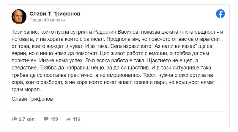 "Предполагам, че повечето от вас са отвратени от това, което виждат и чуват. И аз така. Сега изрази като "Аз нали ви казах" ще са верни, но с нищо няма да помогнат. Цял живот работя с емоции, а трябва да съм практичен. Иначе няма успех. Във всяка работа е така. Щастието не е цел, а следствие. Трябва да направиш нещо, за да си щастлив. И в тази ситуация е така, трябва да се постъпва практично, а не емоционално. Тоест, нужна е експертиза на хора, които разбират, а не хора които искат власт, слава и пари, но всъщност нямат грам морал", пише още Трифонов.