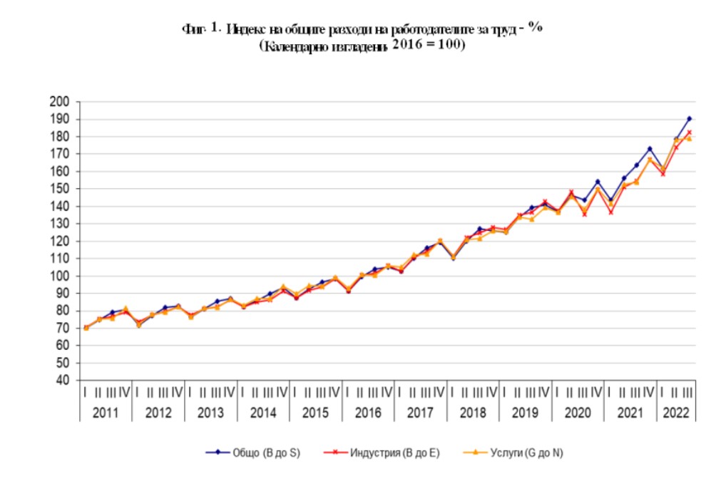 /КРОСС/ С 16.2% нарастват общите разходи на работодателите за един отработен час от наетите от тях лица през третото тримесечие на 2022 г. спрямо третото тримесечие на 2021 година. Това показват предварителните данни на Националния статистически институт.