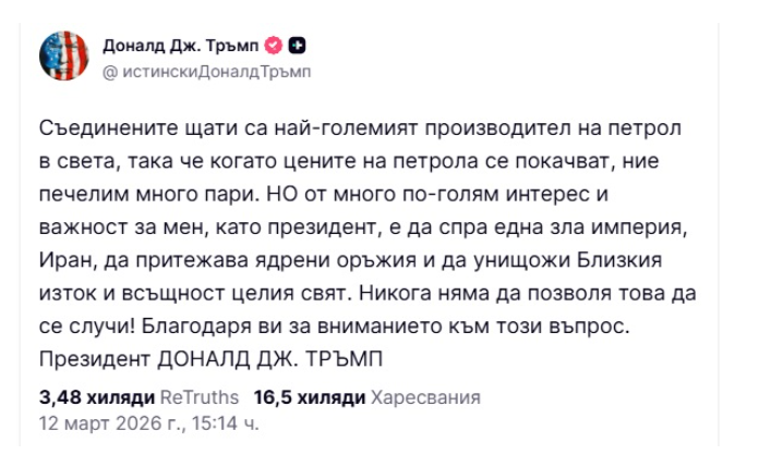 В социалните мрежи вчера Тръмп определи поскъпването като „много малка цена" за премахването на иранската ядрена заплаха. Само „глупаците" биха видели нещата по друг начин, каза той.