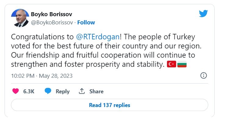/КРОСС/ "Поздравления за Ердоган! Народът на Турция гласува за най-доброто бъдеще на своята страна и нашия регион." Това написа в Twitter лидерът на ГЕРБ Бойко Борисов по повод победата на балотажа на изборите в неделя.