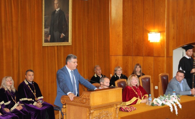 "За мен е изключителна чест и привилегия да ви приветствам с откриването на новата академична година. Това е голям празник на духовността и знанието, защото началото на всяка нова учебна година е преклонение към познанието. То е най-ценният неизчерпаем ресурс, с който ние като човечество разполагаме", посочи пред академичната общност, студентите и гостите на събитието министър Цеков.