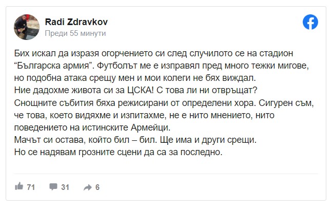 "Бих искал да изразя огорчението си след случилото се на стадион "Българска армия". Футболът ме е изправял пред много тежки мигове, но подобна атака срещу мен и мои колеги не бях виждал. Ние дадохме живота си за ЦСКА! С това ли ни отвръщат? Снощните събития бяха режисирани от определени хора. Сигурен съм, че това, което видяхме и изпитахме, не е нито мнението, нито поведението на истинските Армейци. Мачът си остава, който бил - бил. Ще има и други срещи. Но се надявам грозните сцени да са за последно", написа Радослав Здравков във „Фейсбук".