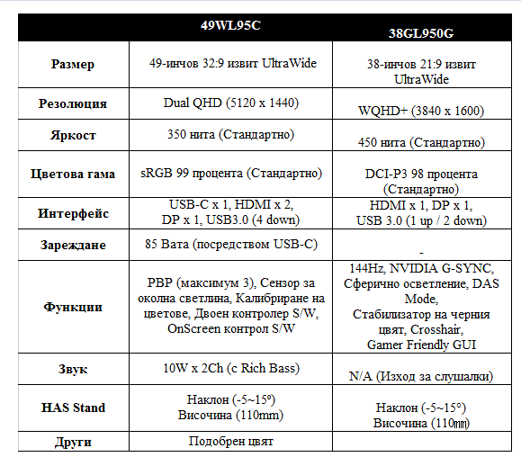 Въз основа на репутацията си на водещ иноватор в категорията монитори UltraWide (със съотношение 21:9 и по-високо), впечатляващият, нов, 49-инчов LG UltraWide монитор (модел 49WL95) е създаден, за да повиши продуктивността при всяка задача докато последният модел LG UltraGear Gaming монитор (модел 38GL950G) комбинира доброто качество на картината с бързата скорост, за да предостави невероятно преживяване на любителите на игри.