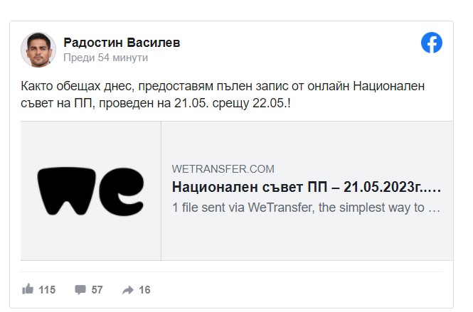 /КРОСС/ "Както обещах днес, предоставям пълен запис от онлайн Национален съвет на ПП, проведен на 21.05. срещу 22.05.", обяви напусналият парламентарната група на ПП-ДБ Радостин Василев във фейсбук, публикувайки аудиофайл с продължителност 4 часа и 37 минути.