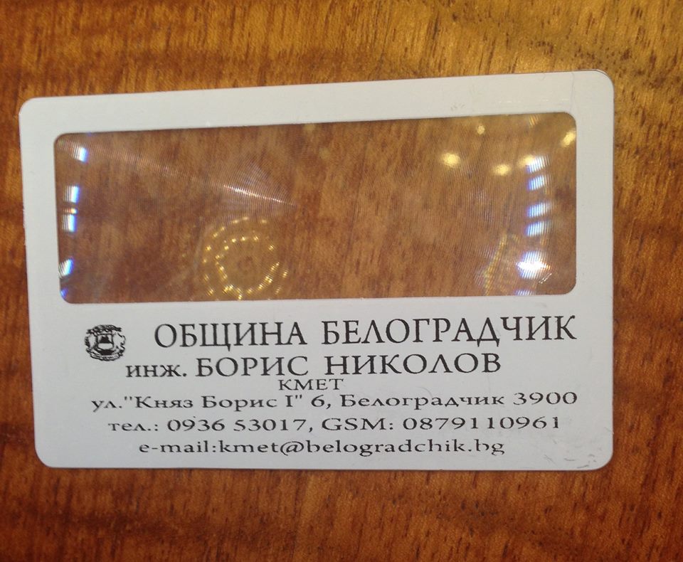 Това е визитката на кмета на Белоградчик. Горната половина е ... лупа. Да си разчитат бабите рецептите.