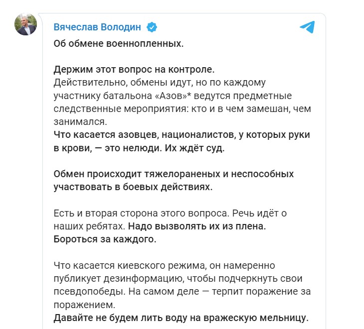 По думите му Русия разменя само тежко ранени бойци от този батальон, но спрямо всеки боец се извършват следствени действия за това кой в какво е участвал. "А що се отнася до азовците, чиито ръце са в кръв - гова не са хора. Тях ги чака съд", написа Володин в "Телеграм".