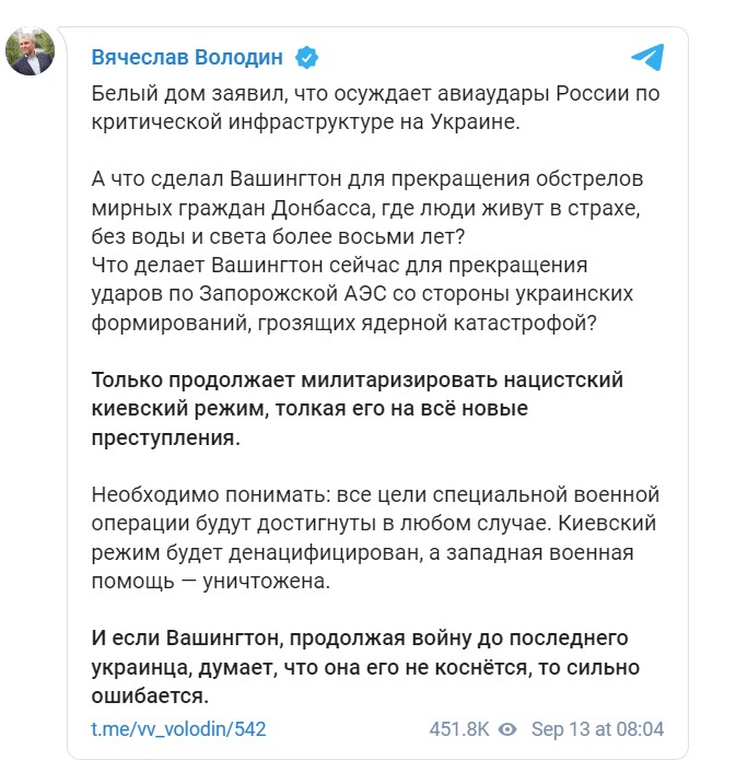 „Ако Вашингтон, продължавайки войната до последния украинец, мисли, че няма да го засегне, тогава той много се лъже", каза Володин.