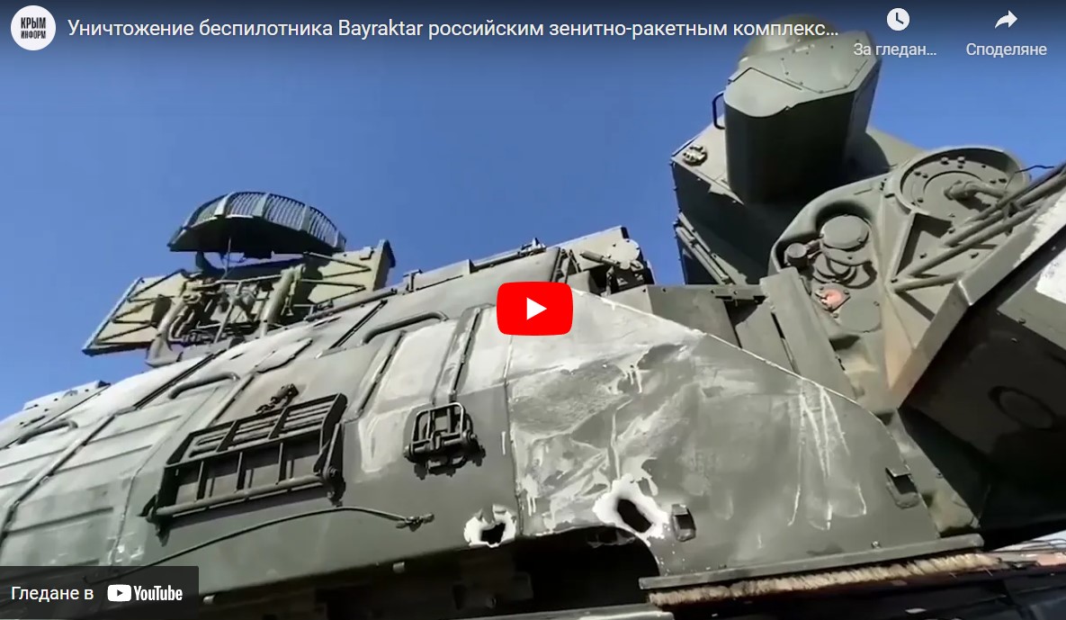 /КРОСС/ Министерството на отбраната на Русия показа кадри от унищожаването на украинския дрон турско производство Bayraktar от екипажа на тактическата зенитно-ракетна система (ЗРС) "Тор", съобщава ТАСС.