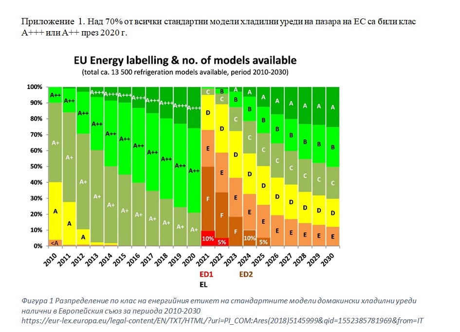Г-жа Искра Василева, старши експерт „Техническа хармонизация и политика за потребителите" в Министерството на икономиката очерта съществената роля на етикета за изпълнението на политиката на ЕС в областта на енергетиката и климата като един от най-добре работещите инструменти за енергийна ефективност. По данни на Европейската комисия, чрез закупуването на високоефективни уреди едно българско домакинство може да спести до 550 лв. на година от сметките си за електроенергия. Без въвеждането на новите изисквания, изборът на ефективно оборудване обаче щеше да е затруднен, тъй като повечето продукти днес на пазара заемат първите три енергийни класа и разграничението става все по-сложно (например за 2020 г. над 70% от всички стандартни модели хладилни уреди на пазара на ЕС са били с клас А+++ или А++ - Приложение 1). „Реално днес на пазара няма хладилен уред, който да е в по-нисък от клас А+. Ако не се направят промените, скоро всички уреди ще се окажат клас А+++" - добави г-жа Василева.