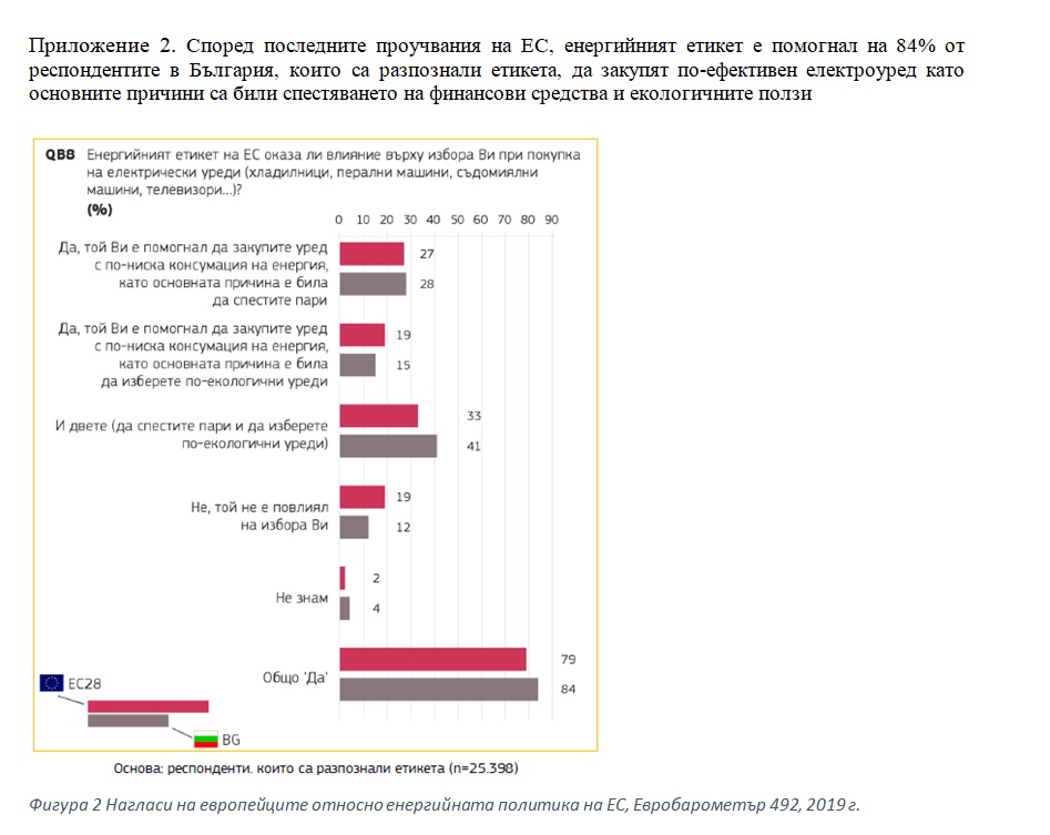 Енергийният етикет на ЕС оказва влияние върху огромен процент от българите при закупуването на енергийно ефективен електроуред (Приложение 2) и затова е важно да се положат необходимите усилия при въвеждането на новите изисквания, допълни г-н Арсенов.