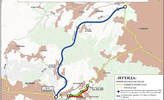 Агенция „Пътна инфраструктура" апелира шофьорите, които ежедневно пътуват между София и Перник, да ползват автомагистрала „Струма", като алтернативен маршрут на първокласния път през Владая.