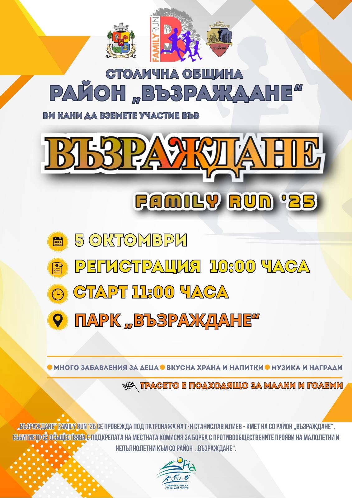 /КРОСС/ На 5 октомври 2025 г. (неделя) парк „Възраждане" ще бъде домакин на спортното събитие „Възраждане Фемили Рън" - маратон, организиран от Столична община - район „Възраждане" и Местната комисия за борба с противообществените прояви на малолетни и непълнолетни. Събитието е част от програмата „София спортува", подпрограма „Спорт в района".