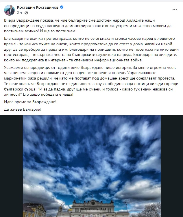 /КРОСС/ „Вчера Възраждане показа, че ние българите сме достоен народ! Хилядите наши сънародници на студа нагледно демонстрираха как с воля, устрем и мъжество можем да постигнем всичко! И ще го постигнем!“, това написа лидерът на Възраждане Костадин Костадинов на страницата си във фейсбук.