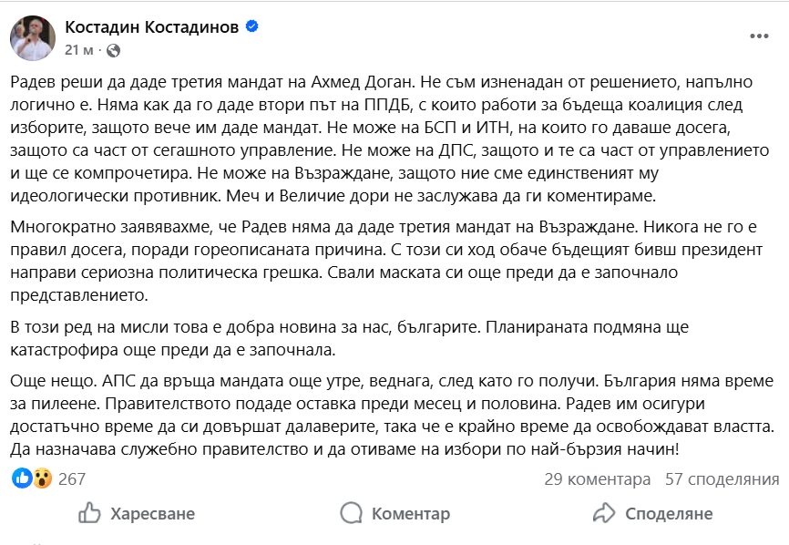 "Още нещо. АПС да връща мандата още утре, веднага, след като го получи. България няма време за пилеене. Правителството подаде оставка преди месец и половина. Радев им осигури достатъчно време да си довършат далаверите, така че е крайно време да освобождават властта. Да назначава служебно правителство и да отиваме на избори по най-бързия начин!", апелира лидерът на "Възраждане".
