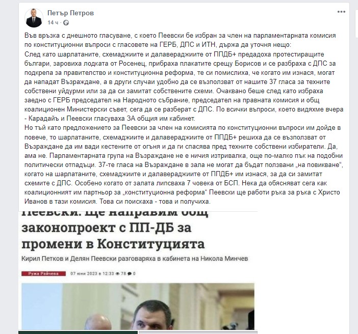 Но тъй като предложението за Пеевски за член на комисията по конституционни въпроси им дойде в повече, то шарлатаните, схемаджиите и далавераджиите от ППДБ+ решиха да се възползват от „Възраждане" да им вади кестените от огъня и да ги спасява пред техните собствени избиратели. Да, ама не. Парламентарната група на „Възраждане" не е ничия изтривалка, още по-малко пък на подобни политически..."