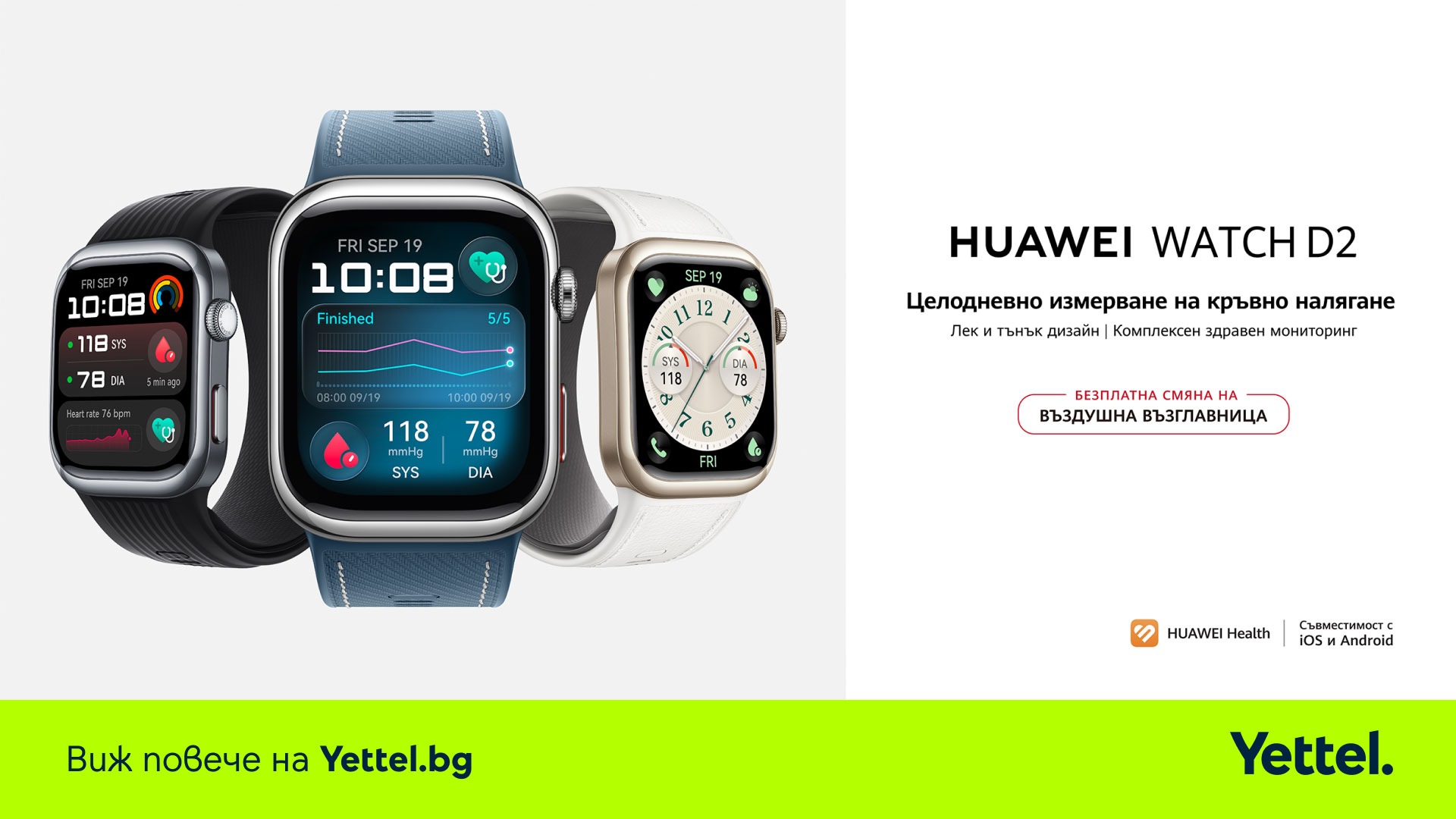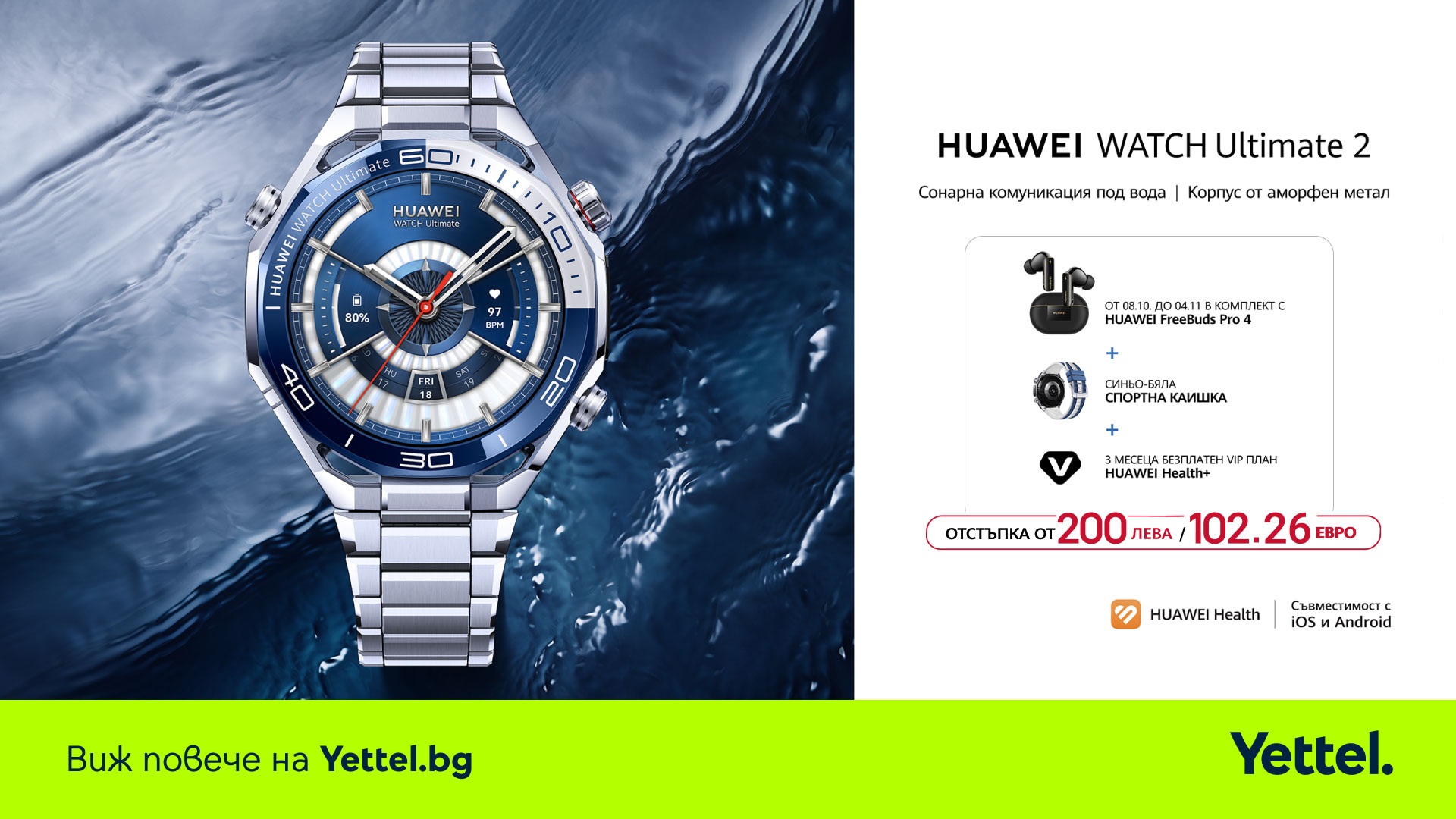 До 4 ноември всеки клиент на Yettel, който закупи HUAWEI Watch Ultimate 2, ще го получи в комплект с безжични слушалки FreeBuds Pro 4 и 3 месеца безплатен достъп до премиум услугата Huawei Health+ от датата на активация. За модела HUAWEI Watch D2 Blue е предвидена сервизна оферта с безплатна смяна на въздушната възглавница в рамките на първите 12 месеца след покупката.