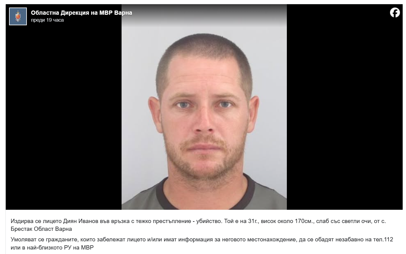 /КРОСС/ Полицията във Варна издирва 31-годишен мъж, заподозрян за убийство. На фейсбук страницата на дирекцията на МВР е обявено, че мъжът се казва Диян Иванов. Той е от село Брестак, Варненска област. Висок е около 170 сантиметра, слаб, със светли очи.