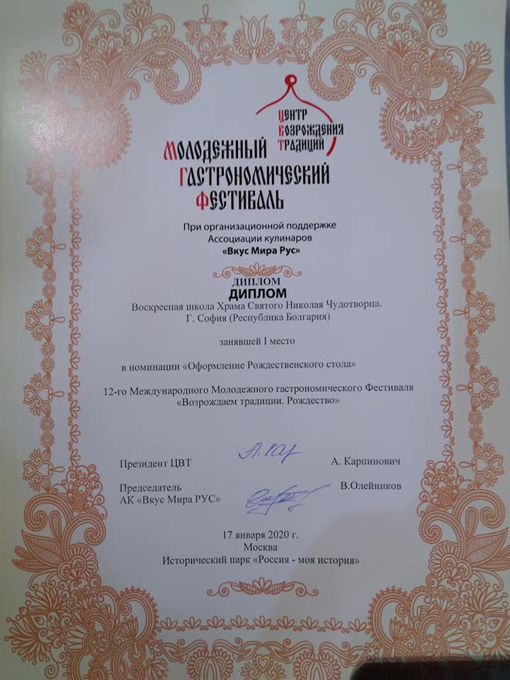 Българските участници представиха страната по достойнство. Отборът на Неделното училище при храм „Св. Николай Мирликийски Чудотворец" в гр.София с ръководители протойерей Методий и съпругата му Милена спечели първо място в номинацията „Украса на коледната трапеза", заедно с други две училища. Участието на Мария Йорданова с автентична рецепта в категорията „Коледни сладки" привлече вниманието на журито и тя лично бе поканена от Руската гилдията на хлебарите и сладкарите да вземе участие в инициативите й в Москва, през април и май 2020 година.